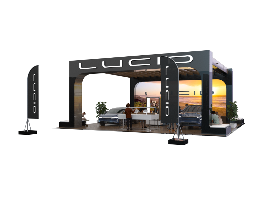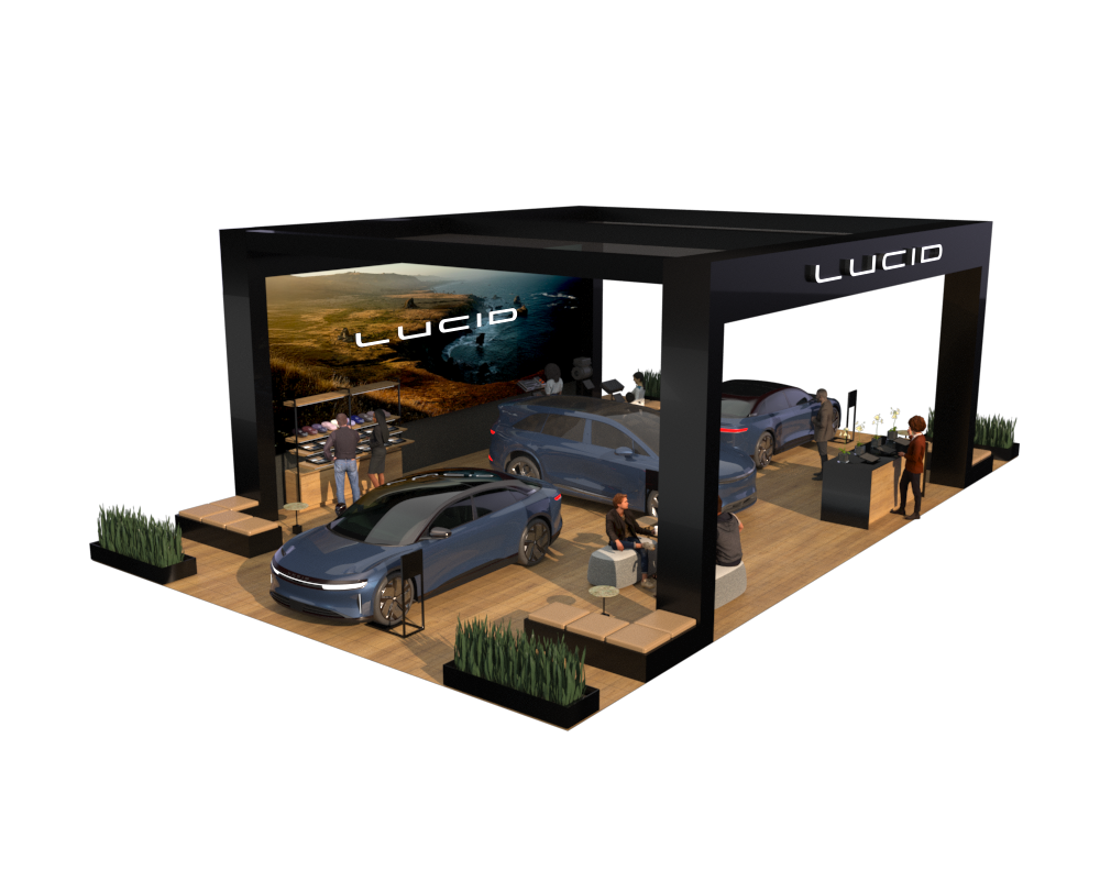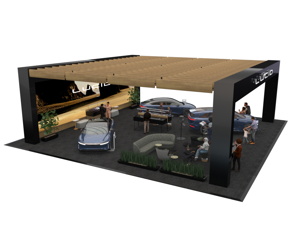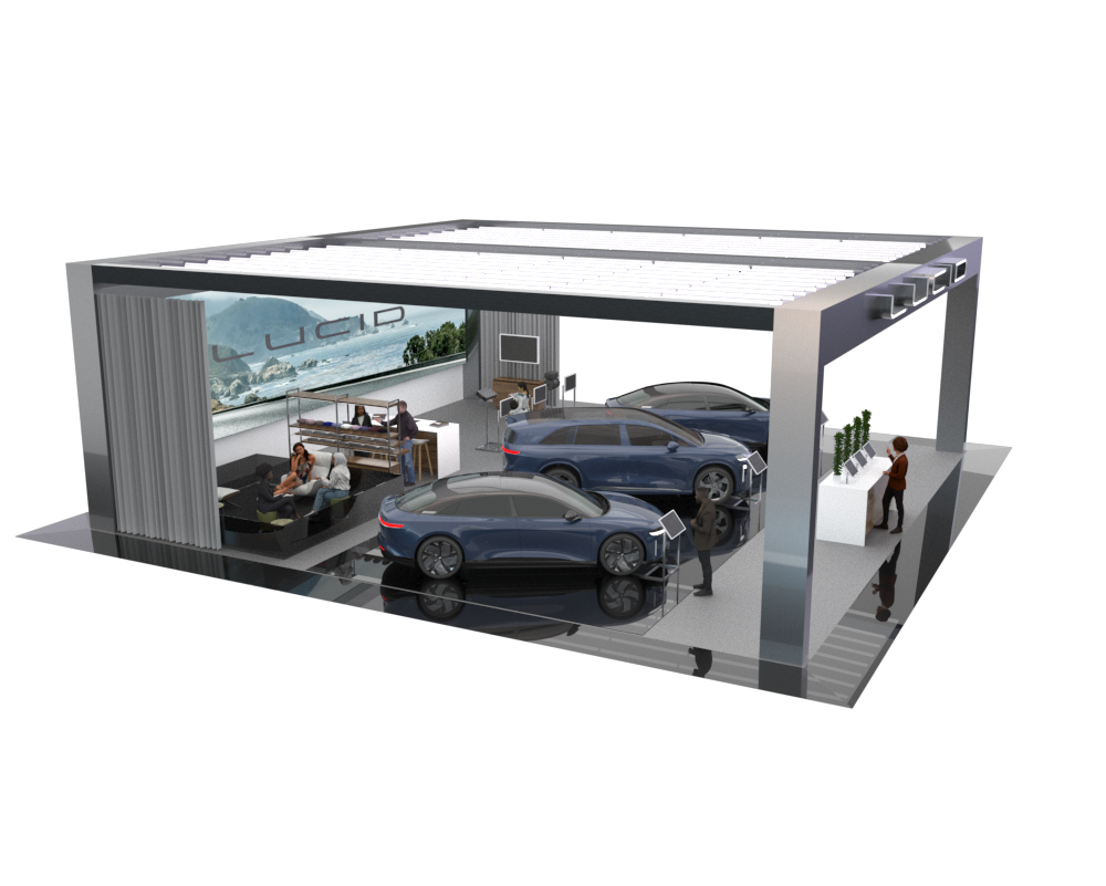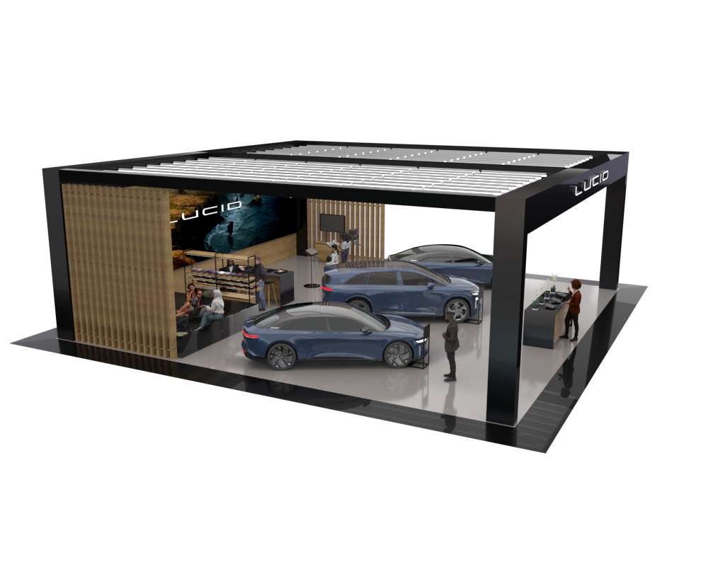Here’s an example of the 50x50-foot stand, featuring modern, minimalistic architecture with a focus on simplicity and functionality. The Lucid arch serves as a key structural element, framing the products and creating a ceiling that incorporates lighting inspired by the design studio to highlight the vehicles and draw attendees. Additional features include options for an LED wall, curtain reveals, and an enclosure for digital hardware, pending organizer approval.